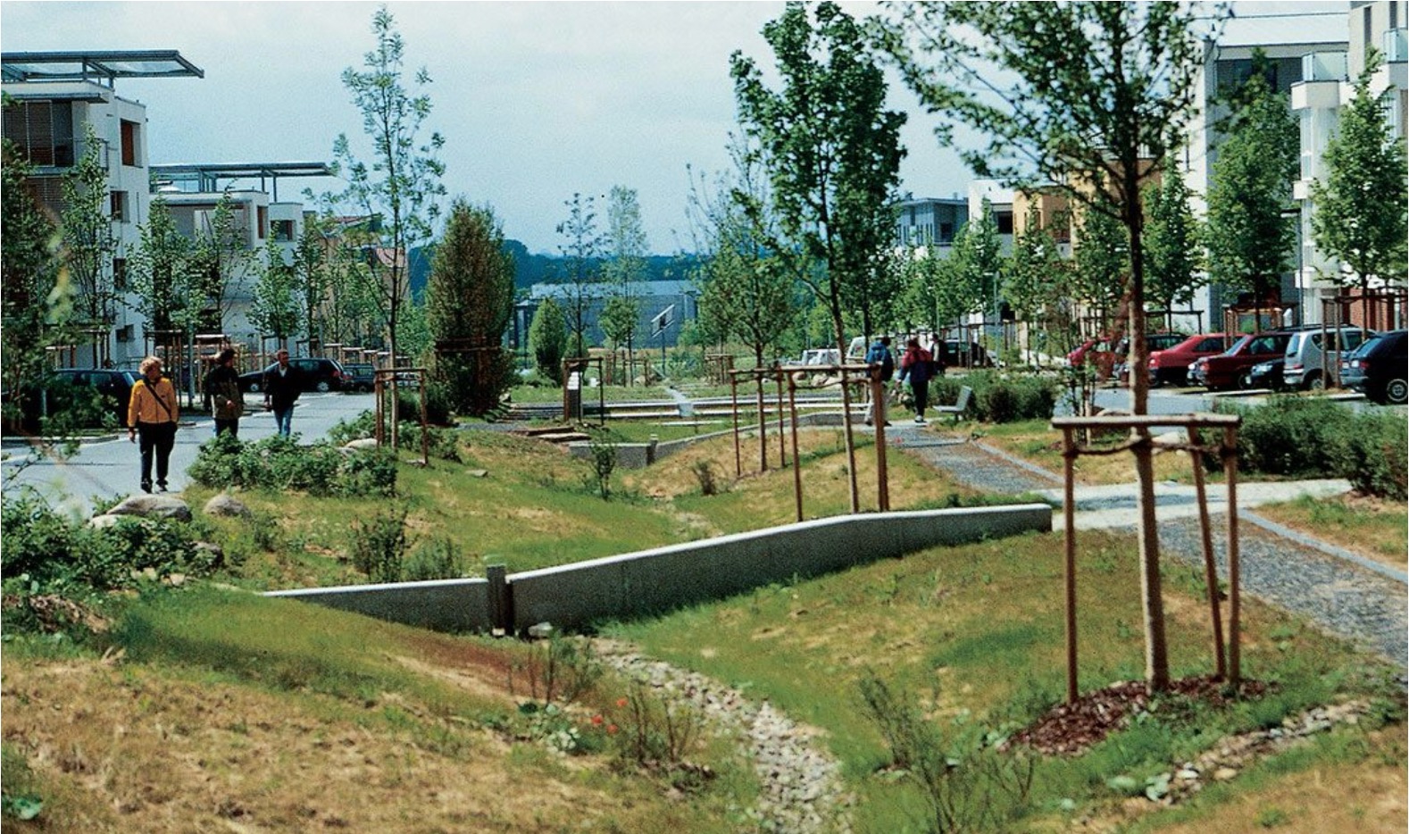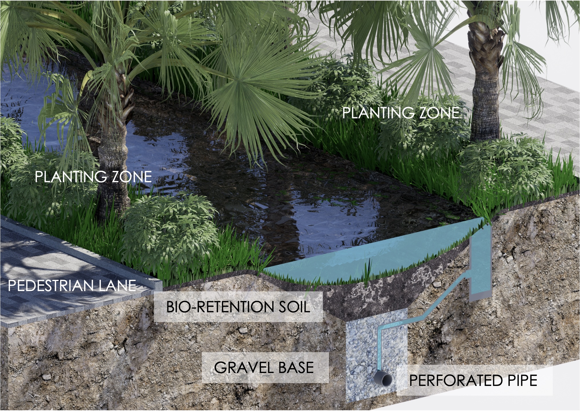 These systems are particularly relevant in Southeast Asia, where rapid urbanization and monsoonal rains contribute to flash floods and water pollution. Bioretention ponds are shallow, vegetated basins designed with layers of soil, sand, and gravel to filter and depollute water, while swales are gently sloping channels that convey and infiltrate runoff, reducing peak flows and recharging groundwater.