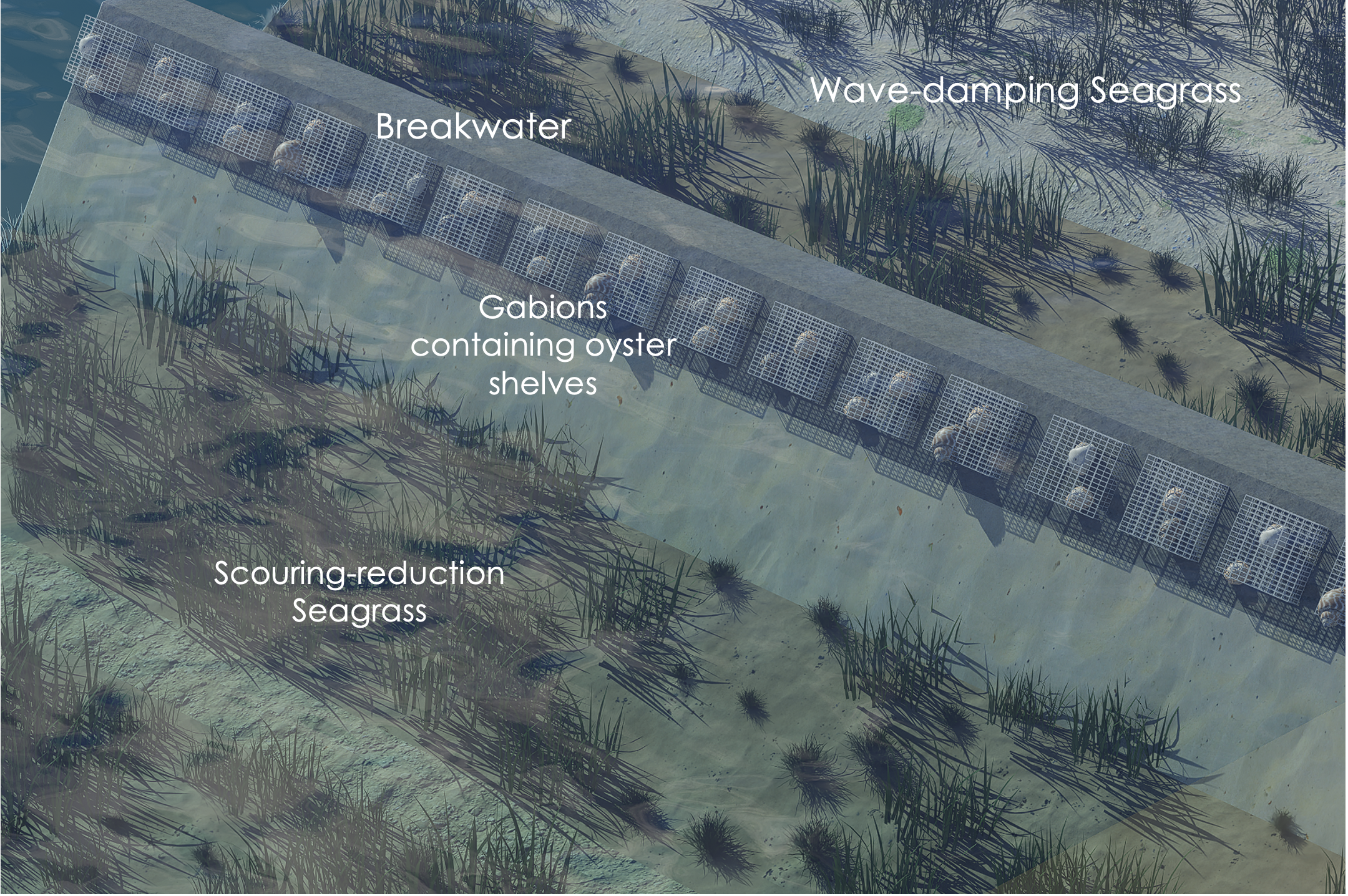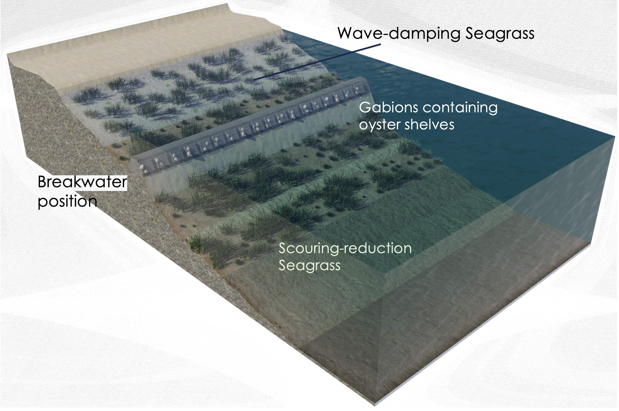 Incorporating seagrass meadows into this system significantly enhances its ecological and protective functions. Seagrasses, with their dense root systems, stabilize the seabed, reduce sediment resuspension, and improve water clarity by trapping particles.