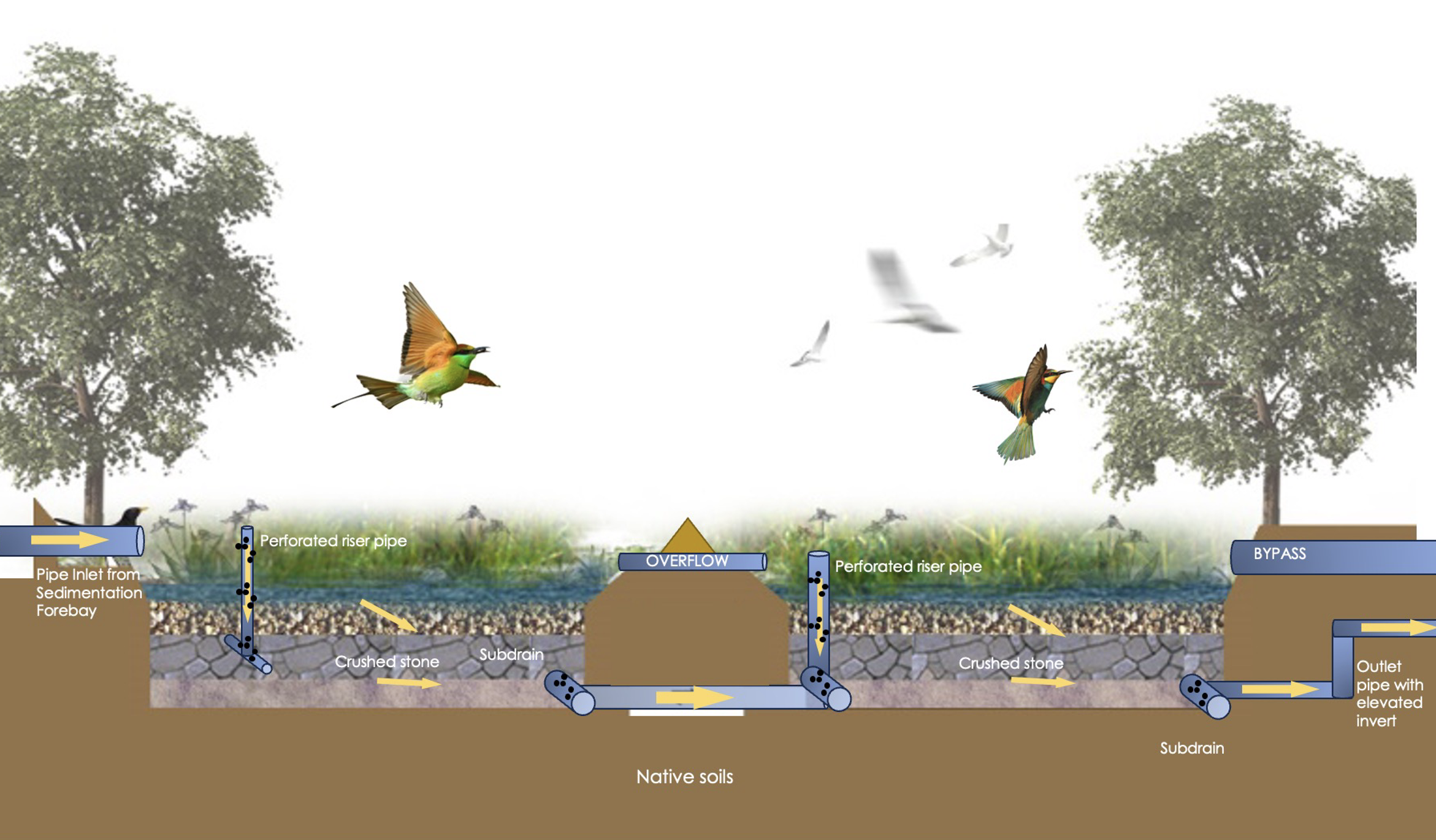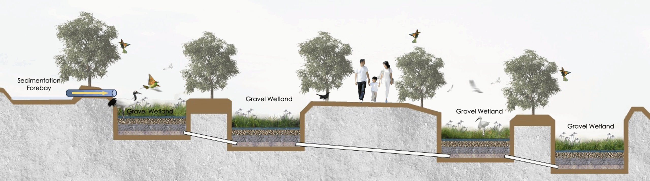 Technically, gravel wetlands filter pollutants, trap sediments, and remove nutrients such as nitrogen and phosphorus, making them effective for water quality improvement.They enhance urban and rural aesthetics, create green buffers along roads, and stabilize soils to prevent erosion. Socially, gravel wetlands provide co-benefits such as recreational spaces, educational opportunities, and improved resilience against climate impacts like flooding and heat stress.