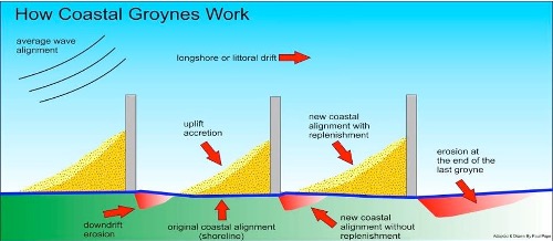 Sand Accumulation Imbalance: Groynes can cause uneven sand buildup, potentially leading to erosion in adjacent areas, requiring precise design and placement to avoid negative impacts on nearby shorelines.
