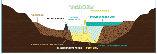 River Levee Setbacks focus on restoring natural river dynamics by relocating levees away from the river’s floodplain, creating space for the river to flood naturally during high-water events.