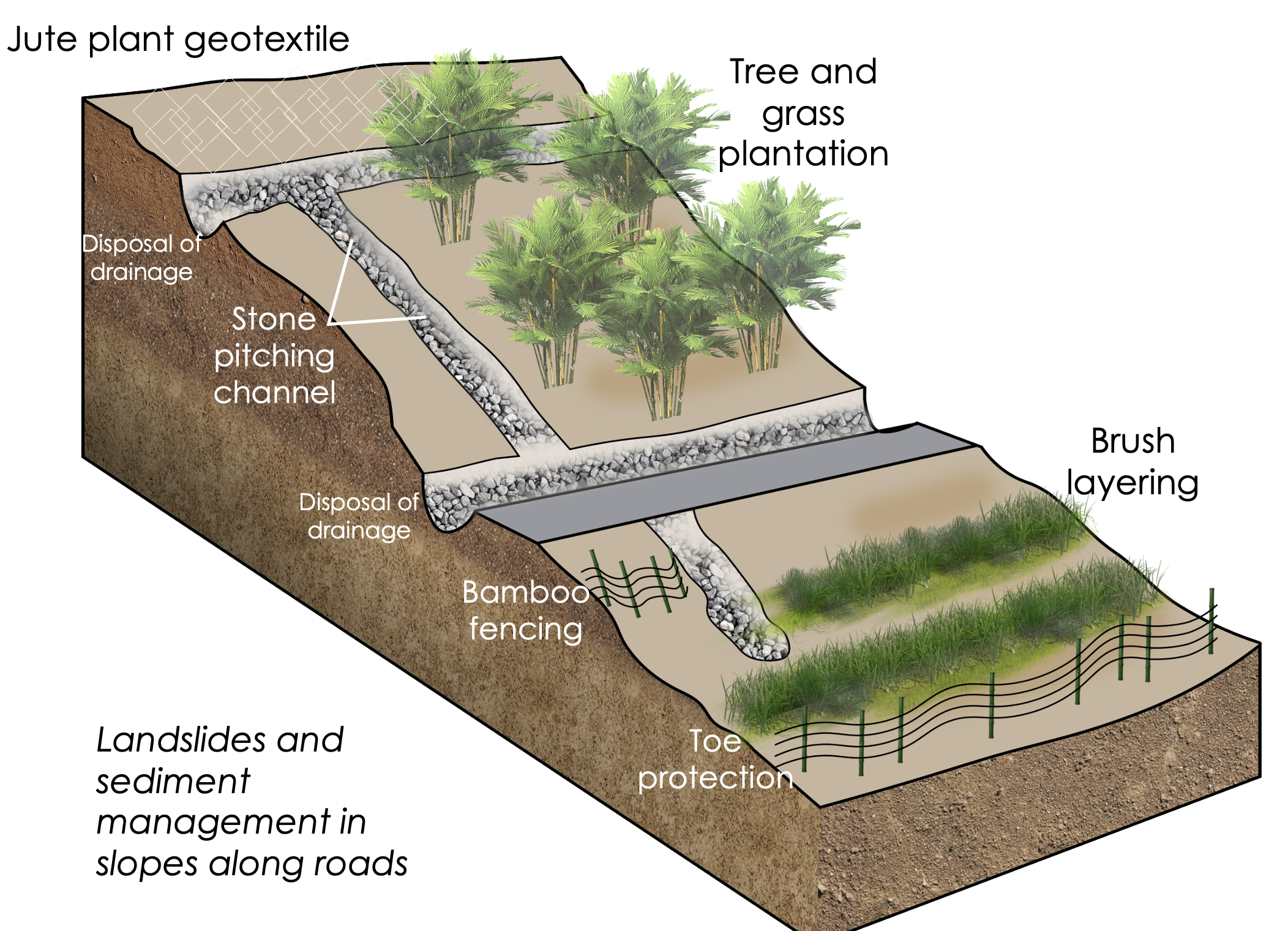 Ecosystem-based roadside bioengineering and slope management address flood control, slope stabilization against landslides, and road infrastructure protection by integrating vegetation, geotextiles, and natural materials into engineered slopes.